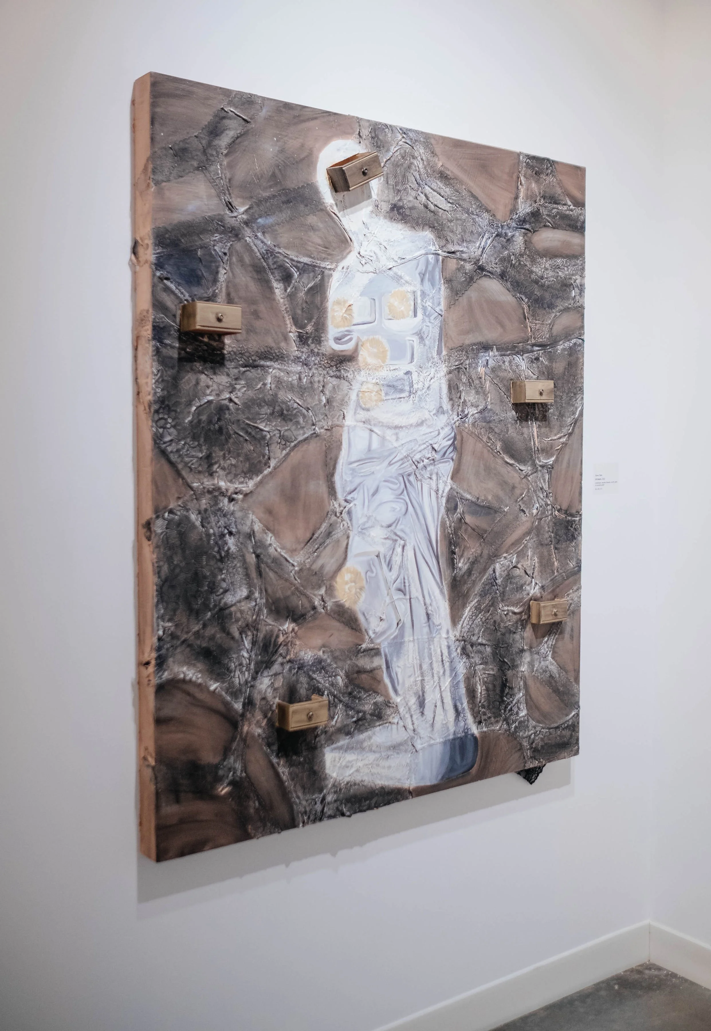 underwear, gesso, acrylic paint, oil paint, found furniture on wood panel